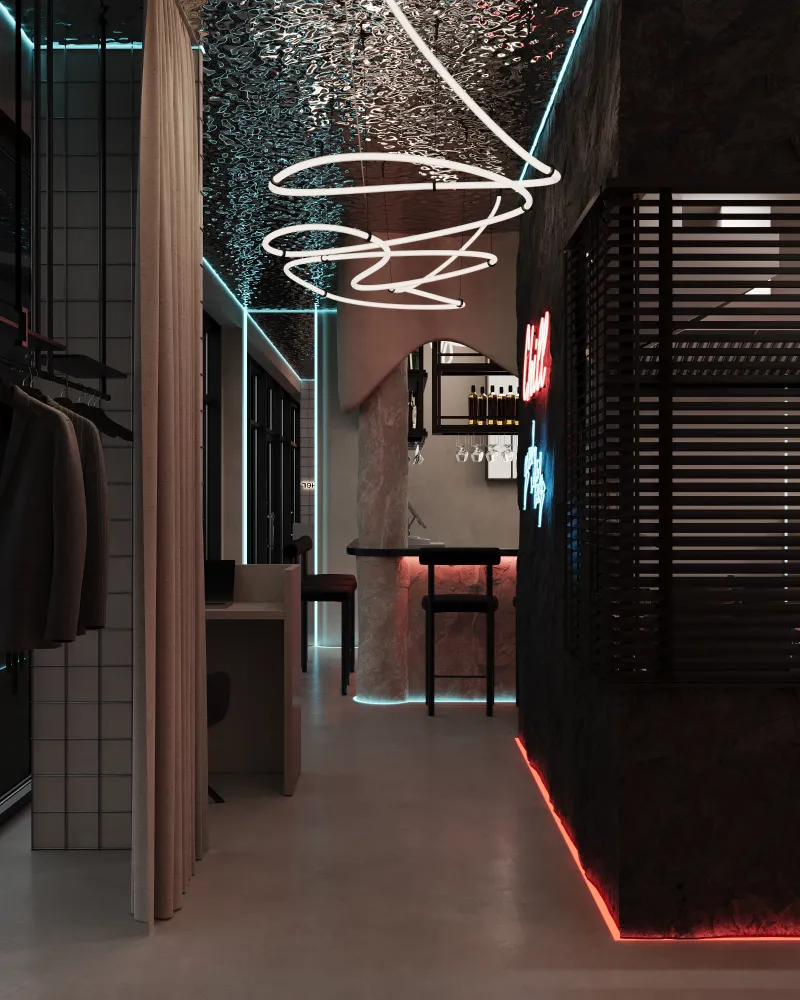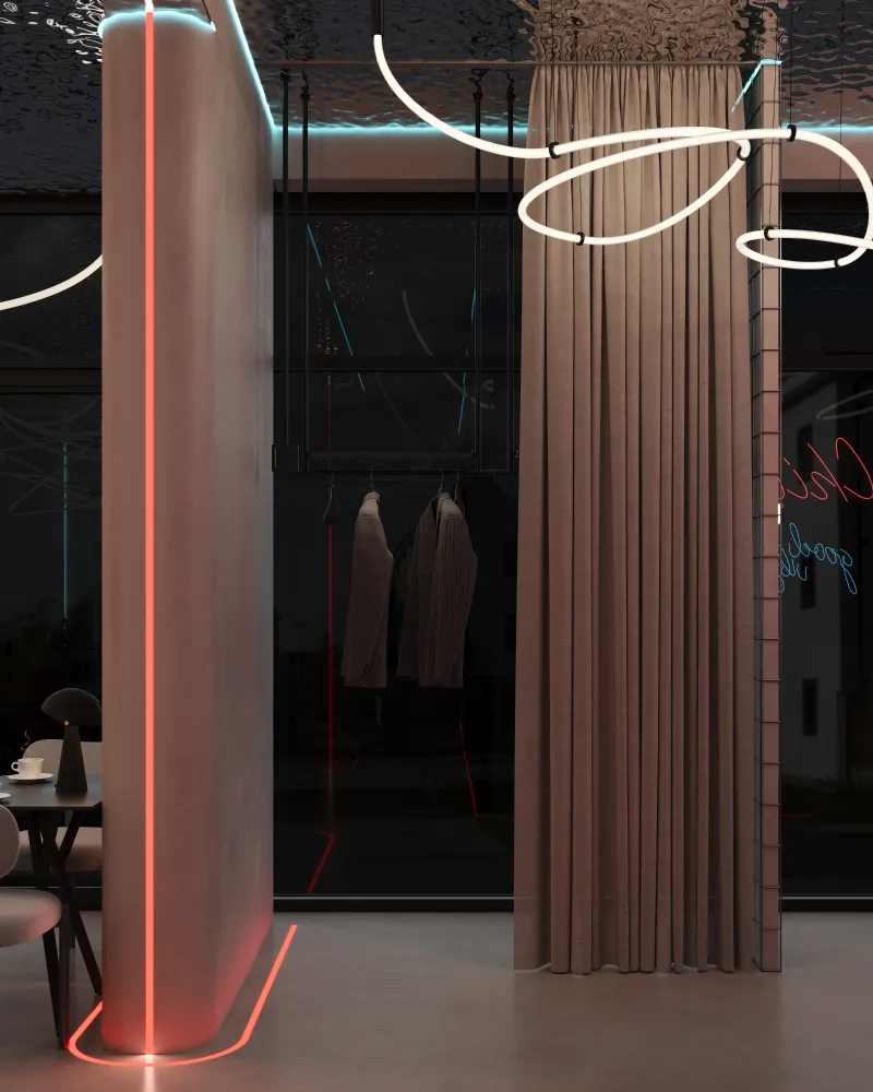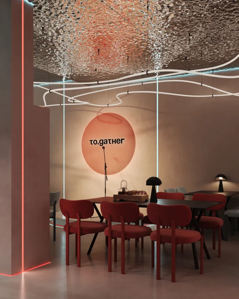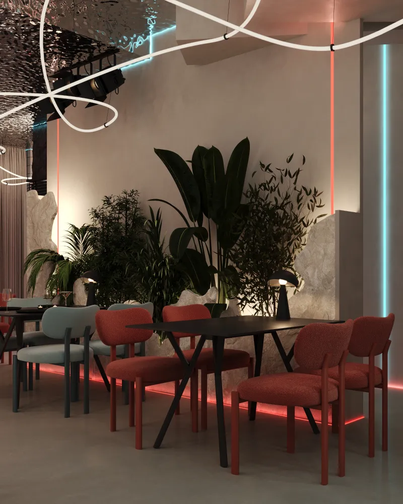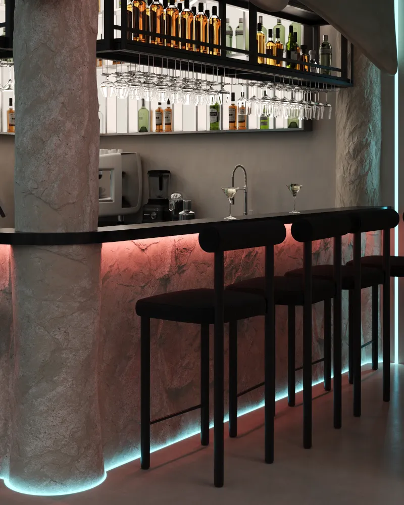 Projekt restauracji w Gdańsku został stworzony tak, aby każdy element wnętrza wprowadzał gości w atmosferę relaksu i komfortu. Gra światła i cienia buduje dynamiczną, a jednocześnie harmonijną przestrzeń, podkreślając charakter lokalu. Unikalne połączenie materiałów i oświetlenia sprawia, że wnętrze staje się niepowtarzalne i zapadające w pamięć.